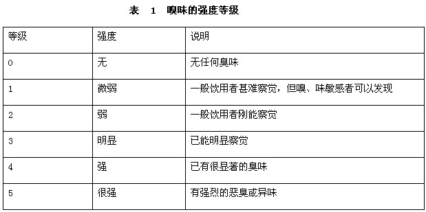 通常對水中的嗅味進行定性、定量分析是較為困難的,《生活飲用水標準檢定法》(GB575085)關于嗅味和味的測定,采取以適當詞語描述,并按六級記錄強度的方法見表1。