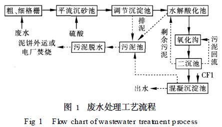廢水(shui)(shui)通(tong)(tong)過(guo)污水(shui)(shui)收集管網直(zhi)流到污水(shui)(shui)處理(li)(li)廠(chang)的(de)粗格(ge)柵(zha)和(he)一級(ji)提升泵(beng)(beng)(beng)站,再由泵(beng)(beng)(beng)提升至(zhi)細格(ge)柵(zha)和(he)平(ping)流沉(chen)砂(sha)池(chi),并投(tou)加濃度為50%的(de)硫酸調節pH; 調節 pH后的(de)廢水(shui)(shui)流入(ru)(ru)調節沉(chen)淀池(chi),再通(tong)(tong)過(guo)二(er)級(ji)泵(beng)(beng)(beng)提升至(zhi)水(shui)(shui)解(jie)酸化池(chi),經(jing)水(shui)(shui)解(jie)酸化后與(yu)二(er)沉(chen)池(chi)回流污泥(ni)混(hun)(hun)(hun)合(he)流入(ru)(ru)氧(yang)化溝,完(wan)成有機(ji)物的(de)好氧(yang)去除;二(er)沉(chen)池(chi)出水(shui)(shui)與(yu)混(hun)(hun)(hun)凝劑CF1混(hun)(hun)(hun)合(he)、反(fan)應、絮凝、沉(chen)淀后外排或(huo)回用。調節沉(chen)淀池(chi)、混(hun)(hun)(hun)凝沉(chen)淀池(chi)的(de)污泥(ni)與(yu)剩(sheng)余污泥(ni)通(tong)(tong)過(guo)污泥(ni)泵(beng)(beng)(beng)排入(ru)(ru)污泥(ni)池(chi)進行均勻混(hun)(hun)(hun)合(he),再通(tong)(tong)過(guo)泵(beng)(beng)(beng)送入(ru)(ru)帶式濃縮一體化壓濾機(ji)進行脫水(shui)(shui)處理(li)(li),泥(ni)餅外運(yun)或(huo)運(yun)至(zhi)與(yu)工業(ye)園(yuan)項目配套的(de)熱電廠(chang)進行烘干、摻煤焚(fen)燒[ 1、2 ] 。