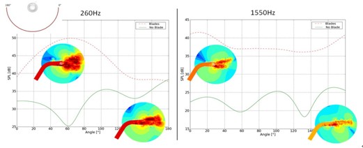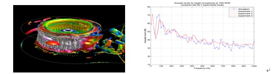 圖1 設備、廠房及相關噪聲控制技術 圖2 仿真結果 圖3 傳動設備聲網格和在某點處的聲壓級 圖4傳動設備聲各部分對輻射功率的貢獻 圖5 鼓風機噪聲渦和噪聲模擬結果與實驗對比,結果吻合良好 圖6 進排氣噪聲模擬 圖7 聲學指向性 |