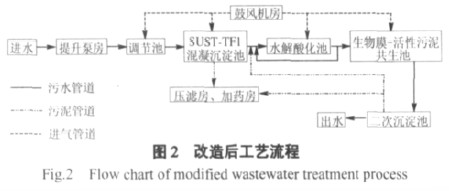 生(sheng)物(wu)(wu)膜- 活(huo)性(xing)(xing)污(wu)泥(ni)(ni)共(gong)生(sheng)系統強化(hua)處理(li)工藝是生(sheng)物(wu)(wu)膜與(yu)活(huo)性(xing)(xing)污(wu)泥(ni)(ni)同(tong)時(shi)在(zai)同(tong)一構筑物(wu)(wu)內(nei)共(gong)同(tong)生(sheng)長,利用懸浮生(sheng)長的(de)(de)活(huo)性(xing)(xing)污(wu)泥(ni)(ni)與(yu)附著生(sheng)長的(de)(de)生(sheng)物(wu)(wu)膜共(gong)同(tong)去(qu)(qu)除(chu)污(wu)水中(zhong)(zhong)有(you)機污(wu)染物(wu)(wu)[5]。該(gai)技術改造是在(zai)生(sheng)物(wu)(wu)接觸氧(yang)(yang)化(hua)池的(de)(de)基礎上(shang)進行的(de)(de),故池中(zhong)(zhong)無(wu)需添加設備,在(zai)保證溶(rong)解(jie)(jie)氧(yang)(yang)DO≥1 mg·L-1的(de)(de)條件下(xia)提高活(huo)性(xing)(xing)污(wu)泥(ni)(ni)濃度至1.5~2.5 mg·L-1,既充分(fen)利用能(neng)耗,又提高好氧(yang)(yang)單元的(de)(de)COD 去(qu)(qu)除(chu)率,保證二沉(chen)池出水達標。同(tong)時(shi)將好氧(yang)(yang)活(huo)性(xing)(xing)污(wu)泥(ni)(ni)回流到水解(jie)(jie)酸化(hua)池中(zhong)(zhong),控制(zhi)水解(jie)(jie)酸化(hua)池中(zhong)(zhong)的(de)(de)溶(rong)解(jie)(jie)氧(yang)(yang)濃度的(de)(de)同(tong)時(shi),還(huan)能(neng)抑制(zhi)活(huo)性(xing)(xing)污(wu)泥(ni)(ni)膨脹(zhang),減少剩余污(wu)泥(ni)(ni)排放量。