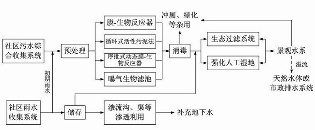 圖3 社區污水再生利用、雨水蓄用與水景觀建設典型技術方案 |