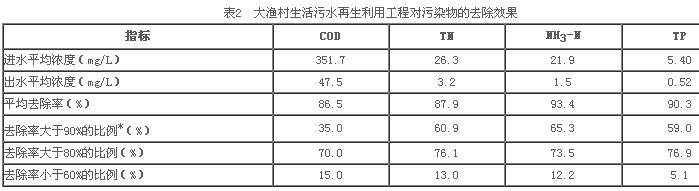 云南大漁村距滇池約2000m。全村共約500戶,現有人口1820人。示范工程設計處理污水量77m3/d,設計進水水質:CODCr200mg/L,氨氮23mg/L,總氮30mg/L,總磷5mg/L。根據工程現場地形特點,采用表面流濕地和潛流濕地相結合的工藝方案。該工程將生態和景觀設計納入到濕地系統,按照紅、黃綠三種顏色協調搭配,植物高低錯落有致的設計原則,對濕地周邊進行了綠化,成為居民生態休閑區。工程對污染物的去除效果見表2。