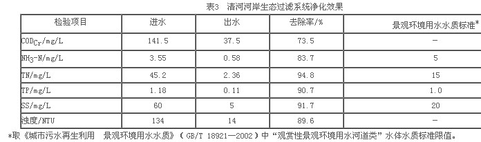工程設計處理規模600m3/d,占地面積800m2。系統采用清華大學自主研發的高效復合功能填料,并選擇栽植了菖蒲、鳶尾、美人蕉、蘆葦等植物,形成復合過濾帶。工程于2005年3月開始設計,7月動工,8月開始通水運行。調試完成后的處理效果如表3所示。