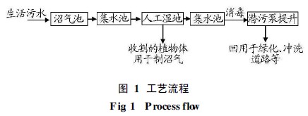 生活(huo)污(wu)(wu)水(shui)(shui)凈化沼氣池- 人工濕地(di)組合工藝主要包括預處(chu)理單(dan)元(yuan)(yuan)(yuan)、輸配(pei)(pei)水(shui)(shui)單(dan)元(yuan)(yuan)(yuan)、人工濕地(di)深度處(chu)理單(dan)元(yuan)(yuan)(yuan)及監測單(dan)元(yuan)(yuan)(yuan)4部分[1]。污(wu)(wu)水(shui)(shui)經(jing)預處(chu)理單(dan)元(yuan)(yuan)(yuan)處(chu)理后, 經(jing)輸配(pei)(pei)水(shui)(shui)單(dan)元(yuan)(yuan)(yuan)進(jin)(jin)入人工濕地(di)進(jin)(jin)行深度處(chu)理, 在人工濕地(di)內, 污(wu)(wu)水(shui)(shui)中的污(wu)(wu)染成分通過(guo)(guo)土壤- 植物(wu)- 微(wei)生物(wu)生態系統的過(guo)(guo)濾、吸(xi)附(fu)、微(wei)生物(wu)降解(jie)和植物(wu)吸(xi)收(shou)等作用被去除。經(jing)過(guo)(guo)處(chu)理的污(wu)(wu)水(shui)(shui)可根據具(ju)體情(qing)況(kuang), 直接由管井收(shou)集后排入河道(dao)或回用。整個工藝流程(cheng)見圖1。