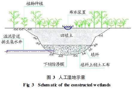 人(ren)工濕地深度(du)處理(li)單元構造由(you)進水(shui)區(qu)、處理(li)區(qu)、出水(shui)區(qu)三(san)部分組成, 并(bing)且底部做好防滲層(ceng) (圖3)。