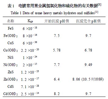 電鍍廢水中的其他重金屬離子一般是指銅、鋅、鎳、鎘等,它們有一種共性,在堿性條件下可形成氫氧化物沉淀;若加入硫化鈉,則形成硫化物沉淀。氫氧化物沉淀和硫化物沉淀的有關數據如表1。