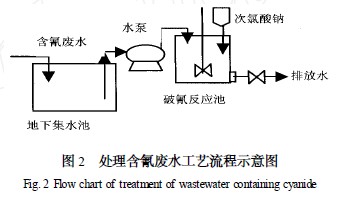 操作時次氯酸鈉與氰氫根的投加比為: CN - :NaOCl = 1 : 3. 42。用稀硫酸把廢水pH 值調整為8. 5~9. 0 ,溫度為15~40 ℃,反應時間約為30min ,第二階段氧化處理是把氰酸鹽連同第一階段氧化反應后留下的殘存的氯化物一起氧化成無毒的CO2 和N2 [7 ] 。