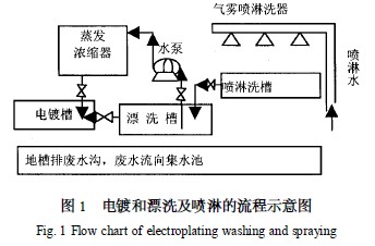 鍍件從電鍍槽取出,放入漂洗槽洗去大部分鍍液,再氣霧噴淋洗滌,鍍件一次氣霧噴淋洗滌比二次漂洗槽洗滌的效果還好。當漂洗槽中鍍液的濃度大到一定程度,則把漂洗液用泵打入蒸發濃縮器,濃縮后補充到電渡槽里,噴淋洗滌水自流放入漂洗槽。較大鍍件沿用原沖洗法,其沖洗水和濺出、散落的水進入地槽溝,流入工業園區的相應集水池待處理。