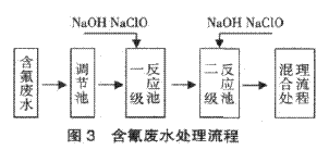 含氰廢液一般都回收處理,只有清洗廢水中含有少量氰(CN-),常用堿性氯化法破氰(絡合氰)。常用含氰廢水處理工藝見圖3。