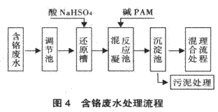 含鉻廢水中,鉻主要以Cr6+的形式存在,在酸性的條件下,投加還原劑將Cr6+還原成Cr3+,然后調節pH至堿性,生成氫氧化鉻沉淀去除,常用的還原劑有亞硫酸鈉、亞硫酸氫鈉、硫酸亞鐵等。