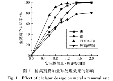 對含Ni2+、Cr3+、EDTA-Cu和焦磷酸銅的混合模擬廢水進行處理,水樣中各金屬離子濃度均為1.0 mg·L-1,pH值為8.0,改變捕集劑投加量,得到各金屬去除率同投加量的變化曲線,如圖7所示.