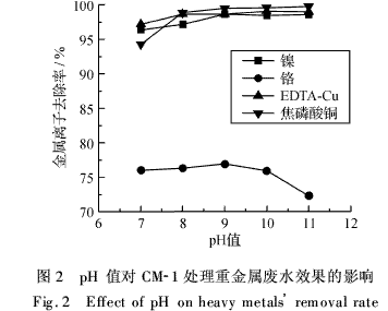 由圖2分析可知,當pH值(zhi)在7~9時(shi)(shi),各金屬(shu)離子(zi)的(de)去(qu)(qu)除(chu)(chu)率均隨著pH值(zhi)的(de)增大而(er)增大;pH值(zhi)繼續(xu)增大時(shi)(shi),Ni2+、EDTA-Cu和焦(jiao)磷酸銅(tong)的(de)去(qu)(qu)除(chu)(chu)率保持不變,而(er)Cr3+的(de)去(qu)(qu)除(chu)(chu)率反而(er)下(xia)(xia)(xia)降(jiang).這主(zhu)要是因為在pH值(zhi)為7~9時(shi)(shi),游離的(de)金屬(shu)離子(zi)以堿性沉(chen)淀(dian)(dian)的(de)方式被(bei)去(qu)(qu)除(chu)(chu);兩性離子(zi)Cr3+在較高pH值(zhi)條(tiao)件(jian)下(xia)(xia)(xia)生成多羥基(ji)化(hua)合物,而(er)CM-1可能對多羥基(ji)化(hua)合物的(de)螯合沉(chen)淀(dian)(dian)能力較差,導(dao)致(zhi)了去(qu)(qu)除(chu)(chu)率的(de)下(xia)(xia)(xia)降(jiang).