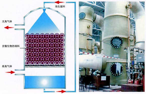生物過濾除臭工藝采用”微生物”降解技術,利用生長在濾料上的除臭微生物對主要致臭物,如H2S、SO2、NH3及大部分揮發性有機物進行降解,除臭效率可達98~99%。