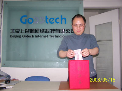 谷騰網全體員工響應號召,2008年5月15日18時共捐得善款:3380元,此筆款項將直接轉交中國紅十字會,支援災區。盡管金額不多,但卻代表谷騰網全體同仁心系災區,關愛同胞,支援災區的心意。