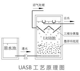 UASB由污泥反應區、氣液固三相分離器(包括沉淀區)和氣室三部分組成。在底部反應區內存留大量厭氧污泥,具有良好的沉淀性能和凝聚性能的污泥在下部形成污泥層。要處理的污水從厭氧污泥床底部流入與污泥層中污泥進行混合接觸,污泥中的微生物分解污水中的有機物,把它轉化為沼氣。沼氣以微小氣泡形式不斷放出,微小氣泡在上升過程中,不斷合并,逐漸形成較大的氣泡,在污泥床上部由于沼氣的攪動形成一個污泥濃度較稀薄的污泥和水一起上升進入三相分離器,沼氣碰到分離器下部的反射板時,折向反射板的四周,然后穿過水層進入氣室,集中在氣室沼氣,用導管導出,固液混合液經過反射進入三相分離器的沉淀區,污水中的污泥發生絮凝,顆粒逐漸增大,并在重力作用下沉降。沉淀至斜壁上的污泥沼著斜壁滑回厭氧反應區內,使反應區內積累大量的污泥,與污泥分離后的處理出水從沉淀區溢流堰上部溢出,然后排出污泥床。