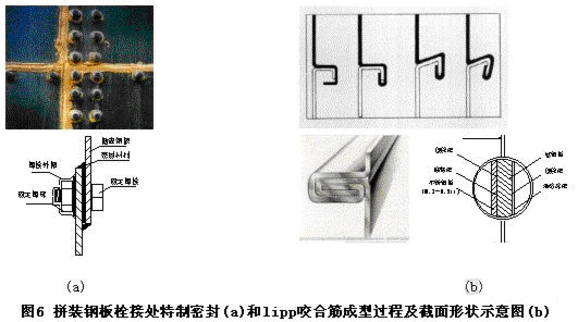 拼裝技術采用高新技術制成的罐體材料,以快速低耗的現場拼裝方式最終成型,組成成套化的單元反應器設備,使污水處理設備的全套裝置達到技術先進、配制合理、性能優良、耐腐性好、維修便利、外表美觀的效果。罐體材料將根據不同反應器采用軟性搪瓷或其他防腐形式預制鋼板。預制的鋼板采用以栓接方式拼裝,栓接處加特制密封材料防漏(見圖6a),此種預制鋼板形成的保護層不僅能阻止罐體腐蝕,而且具有抗酸堿的功能。