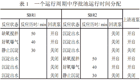 兩個序批池SBR1 和SBR2 的形狀和結構都完全相同 ,兩者交替地完成反應階段和沉淀出水階段為一個運行周期 ,一個運行周期的時間長度可根據進水水質和處理要求靈活確定 ,一般為4 h ,6 h ,8 h等 ,在反應階段的運行方式也可根據需要設定。在中試運行中采用4 h 為一個運行周期 ,序批池的運行時間分配見表1。