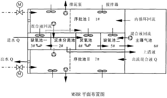 MSBR系統可以根據不同的水質和處理要求靈活地設置運行方式 ,筆者在中試中所采用的裝置主要由6 個功能池組成 ,分別為厭氧池、缺氧池、主曝氣池、泥水分離池和兩個序批池( SBR1 和SBR2) 。MSBR系統的各功能池和運行示意見圖。