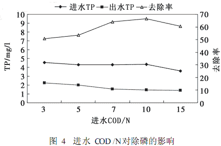 進(jin)(jin)(jin)水(shui)(shui) COD /N對(dui)除(chu)磷的(de)影響在(zai)本實驗中(zhong)(zhong) ,進(jin)(jin)(jin)水(shui)(shui) COD /N對(dui) 6池 MS BR除(chu)磷效果的(de)影響如(ru)圖 4所(suo)示。進(jin)(jin)(jin)水(shui)(shui) COD /N對(dui)磷的(de)去(qu)除(chu)影響不是(shi)很明顯 ,隨進(jin)(jin)(jin)水(shui)(shui) COD /N增(zeng)加 ,出(chu)水(shui)(shui) TP濃度有緩慢(man)下降(jiang)的(de)趨(qu)勢 ,當 COD /N > 7時(shi) ,下降(jiang)趨(qu)勢趨(qu)于平(ping)緩 ,出(chu)水(shui)(shui) TP穩(wen)定在(zai) 1 . 5 mg/ l左右。TP去(qu)除(chu)率(lv)在(zai)COD /N從 3增(zeng)加到 7時(shi)增(zeng)加 , COD /N > 7時(shi)趨(qu)于穩(wen)定。與(yu)一般脫氮除(chu)磷工藝要求(qiu)進(jin)(jin)(jin)水(shui)(shui) COD /N > 4 . 3相(xiang)比 ,MS BR6池工藝要求(qiu)更高的(de)進(jin)(jin)(jin)水(shui)(shui) COD /N比 ,這與(yu)MS BR后置(zhi)反硝(xiao)(xiao)化(hua)的(de)反硝(xiao)(xiao)化(hua)方式有關(guan) ,后置(zhi)反硝(xiao)(xiao)化(hua)使(shi)得反硝(xiao)(xiao)化(hua)碳(tan)源(yuan)不足(zu) ,所(suo)以如(ru)果進(jin)(jin)(jin)水(shui)(shui)中(zhong)(zhong) N含量太高(COD /N < 7) ,不充足(zu)的(de)反硝(xiao)(xiao)化(hua)使(shi)大量的(de)硝(xiao)(xiao)酸鹽隨污泥(ni)回流進(jin)(jin)(jin)入厭氧池 ,影響 PAOs的(de)厭氧釋(shi)磷 ,并(bing)最(zui)終使(shi)系統除(chu)磷效果下降(jiang)。