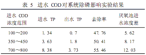 進水 COD濃(nong)度對除磷的影響維持進水中 COD /P = 100、 COD /N = 7不(bu)變(bian) ,改變(bian) COD濃(nong)度對去(qu)除磷的影響見表 5。