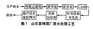 上流式厭氧污泥床和好氧接觸氧化池相串聯的啤酒廢水處理工藝具有處理效率高、運行穩定 、能耗低、容易調試和易于每年的重新啟動等特點。只要投加占厭氧池體積1/3的厭氧污泥菌種,就能夠保證污泥菌種的平穩增長,經過3個月的調試UASB即可達到滿負荷運行。整個工藝對COD的去除率達96.6%,對懸浮物的去除率達97.3%~98%,該工藝非常適合在啤酒廢水處理中推廣應用。