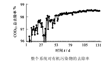 整個系統對有機物的去除情況采用以木薯為主要原料生產檸檬酸過程中所產生的廢水,在調試階段經整個廢水系統處理后,CODCr總去除率保持在98%以上,見下圖。其中,整個好氧系統與氣浮池對有機物的總去除率保持在90%以上,曝氣沉淀池對CODCr的去除率始終保持在55%上下,接觸氧化池出水采用二沉池的出水回流,對CODCr的去除率基本保持在65%以上,對NH3-N的去除率均保持在50%以上,達到了預期目標;進入氣浮池的水投加適當的混凝劑后,完全保證了最終出水CODCr在100mg/L以下,達到了本改造工程的最初目標。