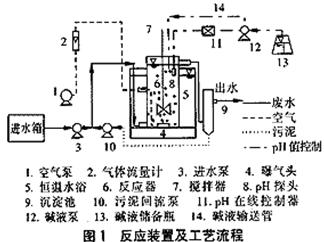 廢水經由進水泵從水箱中提升進入反應器底部,經反應后從出水口進到沉淀池中,沉淀后的上清液排走,污泥則經污泥泵回流進入反應器底部。空氣通過氣泵,經氣體流量計控制氣量后進入反應器。反應器置于恒溫水浴[(35±1)℃]中。試驗中采用了pH在線控制,通過自動投加Na2CO3溶液將pH值控制在7.0~7.8。