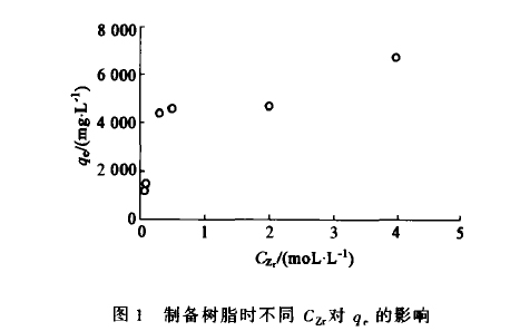 制備負(fu)(fu)載(zai)樹(shu)(shu)脂(zhi)的(de)(de)(de)過程中,在(zai)(zai)相(xiang)同(tong)的(de)(de)(de)實(shi)驗條(tiao)件(jian)下選(xuan)用不同(tong)的(de)(de)(de)鋯(gao)濃(nong)度條(tiao)件(jian)制備負(fu)(fu)載(zai)樹(shu)(shu)脂(zhi).所得的(de)(de)(de)樹(shu)(shu)脂(zhi)分別用于(yu)進行靜態吸附試(shi)驗,得到在(zai)(zai)C一(yi):0.1mol/L時各樹(shu)(shu)脂(zhi)的(de)(de)(de)平衡吸附量q.圖l列出了制備負(fu)(fu)載(zai)樹(shu)(shu)脂(zhi)時不同(tong)鋯(gao)濃(nong)度對q的(de)(de)(de)影響.當鋯(gao)的(de)(de)(de)濃(nong)度為0.08、0.1、0.3、0.5mol/L時,q依次明顯(xian)增(zeng)加.當鋯(gao)的(de)(de)(de)濃(nong)度為2、4mol/L時,q增(zeng)加不顯(xian)著.考(kao)慮到實(shi)際操作成(cheng)本以及藥品過量時會造(zao)成(cheng)浪費,在(zai)(zai)制備負(fu)(fu)載(zai)樹(shu)(shu)脂(zhi)時,選(xuan)擇鋯(gao)的(de)(de)(de)濃(nong)度為0.5mol/L。