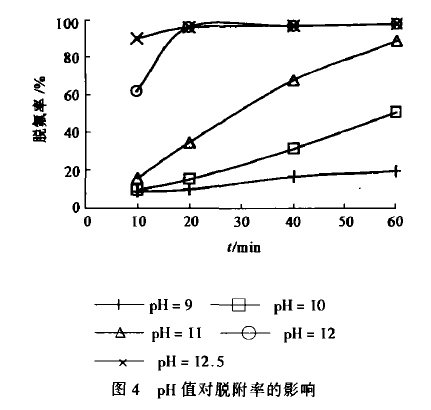 該負(fu)載樹脂吸附氟(fu)離子后,對(dui)其進行靜態脫附試驗,結(jie)果如圖。pH值(zhi)越(yue)高(gao),脫附率(lv)越(yue)高(gao),脫附速度越(yue)快。其中,pH值(zhi)為12.0、12.5條件下,20min時脫附率(lv)已達95%以上。考慮(lv)到實際(ji)操作(zuo)選擇pH值(zhi)為12.0進行脫附。