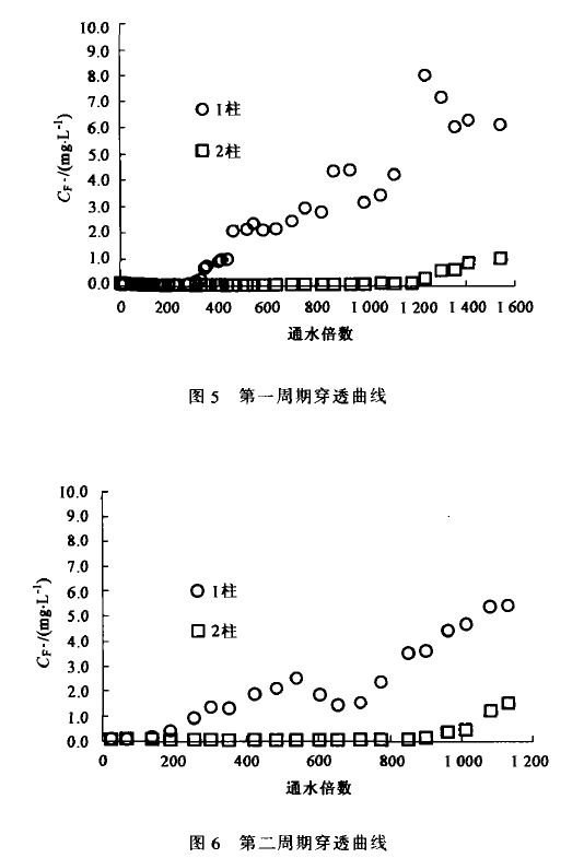 采用雙柱(zhu)(zhu)吸(xi)附,模擬火電(dian)廠含氟廢水成分如下:CF-:10 mg/L,CB3+:200 mg/L,Cca2+:100 mg/L,CMg2:200 mg/L,Cso4~2-=5 500 mg/L Ccl-: 4 000mgiL,其流向(xiang)為經過1柱(zhu)(zhu)流向(xiang)2柱(zhu)(zhu)。動態(tai)吸(xi)附試驗(yan)進行(xing)了兩個周期(qi),結果如圖.運行(xing)第一周期(qi)時(shi)(shi),1柱(zhu)(zhu)和2柱(zhu)(zhu)出(chu)(chu)水達到(dao)1mg/L時(shi)(shi)的(de)通水倍(bei)數分別為410倍(bei)和l500倍(bei);運行(xing)第二周期(qi)時(shi)(shi),l柱(zhu)(zhu)和2柱(zhu)(zhu)出(chu)(chu)水達到(dao)1mg/L時(shi)(shi)的(de)通水倍(bei)數分別為250倍(bei)和l050倍(bei)。負(fu)載樹脂的(de)吸(xi)附容(rong)量較大,但在第二周期(qi)運行(xing)時(shi)(shi),負(fu)載樹脂的(de)吸(xi)附能力有所下降。