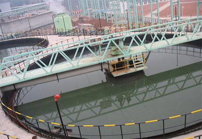 唐鋼的轉爐除塵廢水的治理也經歷了多次改造過程。隨著唐鋼的不斷發展,煉鋼廠已形成年產鋼800萬噸的生產能力,循環水量已達到2400m3/h。主要工藝過程為:一文、二文除塵回水經回水槽自流入粗顆粒分離機再進入斜板沉淀池,經沉淀后的水進入吸水井由泵送至冷卻塔冷卻,冷卻后的水再由泵供用戶循環使用。斜板沉淀池沉淀下來的泥漿送污泥處理系統。斜板沉淀池為6格組合式,單個面積為50m2。斜板沉淀池的頂部進水槽中設有2臺電磁凝聚器,用以磁化水中含量較高的鐵磁性懸浮物,使其在沉淀過程中凝聚成較大顆粒加速沉降。在斜板沉淀池入口處分別加入APC和PAM(聚丙烯酞胺絮凝劑)。圖為唐鋼煉鋼廠的輻流式沉淀池。