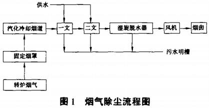 氧氣頂吹轉爐冶煉產生的約24000Nm3/h。爐×3煙氣經固定罩收集后,采用雙級文氏管濕式凈化,煤氣未做回收,燃燒后排放,煙氣除塵流程如圖1所示。