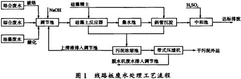 改造后的線路板廢水處理工藝流程如圖1所示。絡合廢水和油墨廢水分別經過破絡和酸化處理后,與其他酸堿、含銅等綜合廢水一起經收集管道輸送到調節池,氣體攪拌混合,調節水質水量,同時投加NaOH調節pH。調節池廢水經泵提升進人硅藻土反應器,投加硅藻精土凈水劑進行混凝沉淀,去除金屬離子、懸浮物以及部分有機物,反應器出水進人集水池,再泵人斜管沉淀池,利用硅藻精土凈水劑或硅藻土反應器排放污泥進行混凝沉淀,進一步吸附去除水體中的金屬離子,沉淀池出水進人中和池調節pH后達標排放。硅藻土反應器和斜管沉淀池排放污泥經濃縮和帶式壓濾機脫水后外運至專門的固廢處理站處理。
