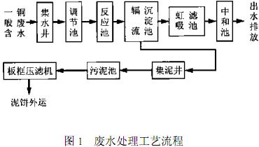 設計原水水質:Cu2+≤100mg/L。水量15000m3/d。要(yao)求廢(fei)水經(jing)處理(li)(li)后(hou)達標排放,即總銅≤015mg/L,pH為6~9。廢(fei)水處理(li)(li)工(gong)藝流程(cheng)見圖1。