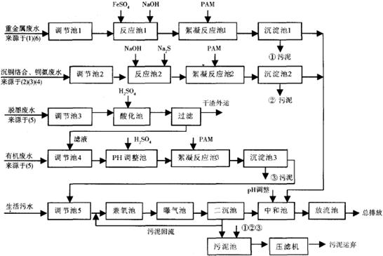 采(cai)用分(fen)質、分(fen)類處(chu)(chu)理的(de)方法,含重(zhong)金屬銅離子為主的(de)廢(fei)水(shui)(shui)(shui)以物化沉淀為主的(de)工藝,含有機物為主的(de)顯影廢(fei)水(shui)(shui)(shui)與(yu)生活污水(shui)(shui)(shui)采(cai)用生化方法處(chu)(chu)理,該廢(fei)水(shui)(shui)(shui)處(chu)(chu)理系統運行(xing)穩定,經處(chu)(chu)理后排(pai)(pai)放水(shui)(shui)(shui)質達到《污水(shui)(shui)(shui)綜合排(pai)(pai)放標準》(GB8978-1996)一級排(pai)(pai)放標準。廢(fei)水(shui)(shui)(shui)處(chu)(chu)理工藝流程如圖1所(suo)示。