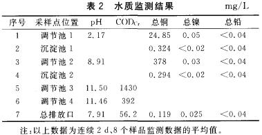 經(jing)過1年多的(de)運行,該處理(li)系統(tong)出(chu)水(shui)水(shui)質(zhi)穩定,水(shui)質(zhi)監(jian)測結果(guo)見表(biao)2。由表(biao)2可看出(chu),一(yi)(yi)般情況下,總排放(fang)口處理(li)出(chu)水(shui)的(de)各項指標(biao)均(jun)達到了(le)《污水(shui)綜合排放(fang)標(biao)準》(GB8978-1996)一(yi)(yi)級排放(fang)標(biao)準,處理(li)效果(guo)較好。