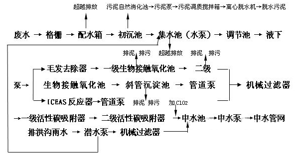 廢水通過格柵井進入,經過格柵、初沉池一級處理后,由液下泵打到兩級生物接觸氧化池、斜管沉淀池(或ICEAS反應器)做二級處理,最后再經過機械過濾器和活性炭吸附器做最后的深度處理,從而確保了中水水質符合回用標準。