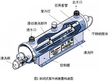 因為醫院污水的排放量都比較小,故大多采用封閉式的紫外消毒設備。所謂封閉式就是用金屬筒體和帶石英套管的紫外線燈把要消毒的水封閉起來。結構形式如圖1所示。