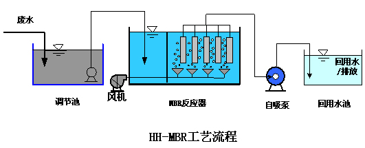 HH-MBR反應器主要由膜組件和膜生物反應器兩部分構成。MBR技術用超濾或微濾膜分離技術取代傳統的活性污泥法的二沉池和常規過濾單元,使水力停留時間(HRT)和泥齡(SRT)完全分離,這樣大量的微生物(活性污泥)在生物反應器內與基質(廢水中的可降解有機物等)充分接觸,通過氧化分解作用進行新陳代謝以維持自身的生長、繁殖.使有機污染物降解。膜組件通過機械篩分、截留等作用對廢水和污泥混合液進行固液分離。大分子物質等被濃縮后返回生物反應器,從而避免了微生物的流失。生物處理系統和膜分離組件的有機結合,不僅提高了系統的出水水質和運行的穩定程度,還延長了難降解大分子物質在生物反應器中的水力停留時間,加強了系統對難降解物質的去除效果。由于出水懸浮物和濁度接近于零,并可截留大腸桿菌等生物性污染物,處理后出水可直接回用,特別適合于中水回用處理,是二十一世紀高科技在水處理中的應用熱點。