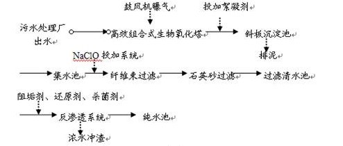 通過高效生物氧化塔前處理系統,實現常規過濾取代雙膜法中的超濾系統,最后經反滲透,達到城市污水深度處理回用于電廠工業用水的效果,降低一次性投資和運行費用。