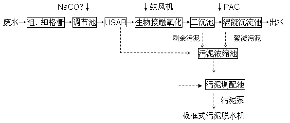 針對此廢水有機物濃度高,可生化性較好的特點,選用以“UASB+生物接觸氧化法”為主,絮凝沉淀為輔的處理工藝,UASB采用中溫厭氧方式。