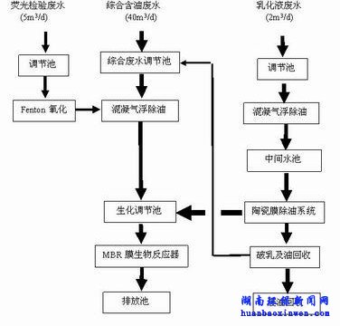 乳化液廢水(shui)→調(diao)(diao)節(jie)池(chi)→混凝反應(ying)→氣浮分離→陶(tao)瓷膜(mo)除油系統→生化調(diao)(diao)節(jie)池(chi)(熒光廢水(shui)調(diao)(diao)節(jie)池(chi));