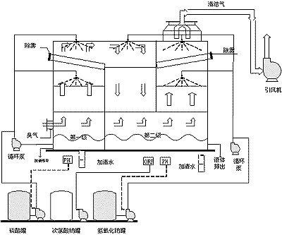 濕式吸收氧化法是一種被廣泛應用于惡臭控制,非常成熟、穩定,有效的工藝方法。該工藝最適合于處理大氣量,高濃度的惡臭氣流,如污泥穩定、干化處理和焚燒過程所產生的惡臭等。常用的設備有三種塔:填料塔、噴霧塔和文丘里洗滌塔。它們的設計宗旨就是最大限度地增加液-氣接觸,增進傳質速率,從而達到較高處理率。在該處理工藝中,惡臭氣體首先被化學溶液吸收,然后被氧化,處理效果取決于惡臭氣體在化學溶液中的溶解度。當惡臭氣流中同時含有氨氣,硫化氫和其它含硫氣體時,通常需采用多級吸收系統,第一級用水或硫酸溶液吸收除去氨氣,然后用氫氧化鈉提升pH值,再由次氯酸鈉等氧化劑溶液吸收和氧化其余的惡臭氣體,如硫化氫,硫醇和二甲基硫等,最后經過除霧裝置以后,直接排放或與干凈空氣混合稀釋后排放到大氣中去。該方法的優點是通過兩級或三級吸收系統,可以廣泛地除去多種惡臭氣體,并達到很高的去除效率。該系統可以通過調節加藥量和溶液的循環流量來適應氣流量和濃度的變化,因此具有較強的操作彈性。濕式吸收氧化法直接借用了化學工業里的單元操作理論和實踐經驗,具有非常成熟、可靠、有效,特別是占地面積小等優點,因此,在美國等發達國家得到廣泛應用,并在未來相當時期內仍將是惡臭控制技術的主流,特別是針對老廠的改造和有土地局限性的新建廠的除惡臭更俱優勢。濕式吸收氧化法也有它的缺點,如需要消耗大量的水和化學溶液,電力等。如果除霧裝置設計不當,可能會在排放氣體中夾帶殘留的氯化物,使得排氣中有類似于漂白劑的氣味。所以,除霧裝置也是非常重要的系統組成部分。