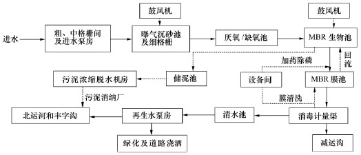 原水首先經過粗格柵去除粗大漂浮物,再經過中格柵進一步去除雜物后由泵房進行提升,然后經曝氣沉砂池去除砂礫,再經過1 mm細格柵進行精過濾去除微細雜物,然后進入厭氧、缺氧、好氧生物反應池去除C、N、P 污染物質,生物反應池的出水經超濾膜過濾; 經過MBR 池處理后,水質已達到出水標準。出水進入紫外線消毒渠進行消毒后,一部份重力排入減運溝,其余進入清水池,再由再生水泵房再加壓后回用( 見圖1) 。