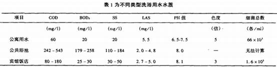 由于人們生活習慣的不同,洗浴污水的水量和濃度也有明顯的差異。但一般情況下洗浴污水中除含人體皮膚分泌物、油脂、毛發、紙屑、污垢外,還含合成洗滌劑和香精等污染物質以及細菌、致病菌和病毒等。表1為不同類型洗浴用水水質。