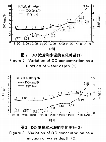 中試結果表明(ming),純(chun)氧(yang)(yang)曝氣可有效地降(jiang)低黑(hei)臭水(shui)(shui)(shui)體(ti)中COD濃度,特別(bie)是(shi)水(shui)(shui)(shui)團流連(lian)較緩,處于(yu)平潮流態時,COD的(de)(de)(de)(de)(de)去除率可達19.5%-55.6%。再經過純(chun)氧(yang)(yang)曝氣后(hou),水(shui)(shui)(shui)體(ti)的(de)(de)(de)(de)(de)BOD/COD值,從0.46降(jiang)至0.40,水(shui)(shui)(shui)體(ti)顏色(se)由黑(hei)變淺(qian),臭味減弱。這(zhe)說(shuo)明(ming)在(zai)純(chun)氧(yang)(yang)曝氣過程中發生了還原物質的(de)(de)(de)(de)(de)氧(yang)(yang)化(hua)和有機污染(ran)(ran)物的(de)(de)(de)(de)(de)生物降(jiang)解。試驗所(suo)在(zai)的(de)(de)(de)(de)(de)河(he)段(duan)是(shi)一條感潮河(he)流的(de)(de)(de)(de)(de)下游,隨著(zhu)潮汐(xi)的(de)(de)(de)(de)(de)漲落(luo),河(he)水(shui)(shui)(shui)水(shui)(shui)(shui)位有連(lian)續變化(hua)。如在(zai)水(shui)(shui)(shui)質污染(ran)(ran)不太嚴重且流速較慢時,純(chun)氧(yang)(yang)曝氣引入的(de)(de)(de)(de)(de)氧(yang)(yang)未被(bei)還原反應(ying)和生物降(jiang)解耗盡,于(yu)是(shi)隨著(zhu)水(shui)(shui)(shui)深的(de)(de)(de)(de)(de)增加,水(shui)(shui)(shui)中的(de)(de)(de)(de)(de)DO濃度會顯著(zhu)升高。見圖2、3。