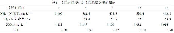 試驗廢水的pH值一(yi)(yi)般為718—910,為了將其中的氨(an)(an)氮(dan)充分轉(zhuan)化為游離(li)氨(an)(an),提高(gao)吹(chui)脫除(chu)氨(an)(an)的效果,用(yong)石(shi)灰水調節廢水的pH值至915左右。雖然(ran)pH值越高(gao)越有利于滲濾液(ye)中的氨(an)(an)氮(dan)充分轉(zhuan)化為游離(li)氨(an)(an),但是(shi)過高(gao)的pH值不(bu)僅要求在調節時(shi)投入(ru)(ru)大量石(shi)灰,而且(qie)在吹(chui)脫處(chu)理(li)后,還要將過高(gao)的堿性(xing)用(yong)酸調節到接(jie)近中性(xing),才(cai)能進入(ru)(ru)后續生化處(chu)理(li)系統,這(zhe)一(yi)(yi)系列的操作(zuo)無疑會增加運行成本和運行操作(zuo)的難度(du)。綜合考慮,選擇915作(zuo)為吹(chui)脫除(chu)氨(an)(an)時(shi)的pH值為最佳(jia)。改變吹(chui)脫時(shi)間,取(qu)樣測(ce)定(ding)不(bu)同吹(chui)脫時(shi)間出水的氨(an)(an)氮(dan)、CODCr、pH值,見表1。