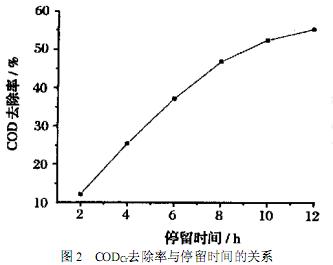 在(zai)(zai)其(qi)它條件不變的情況下,改變廢水在(zai)(zai)水解酸化反應器(qi)的停(ting)留(liu)時間,測定出(chu)水的CODCr值,得出(chu)停(ting)留(liu)時間對CODCr去除(chu)率的影響,見圖2。