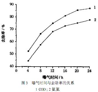 改變曝(pu)氣(qi)時間,在沉淀期為(wei)2h,保持其它條件不變的情況下進行(xing)試(shi)驗,研究曝(pu)氣(qi)時間變化(hua)對處理效果的影響(xiang),見圖(tu)3。