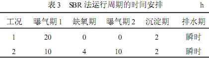 將SBR處(chu)理(li)的(de)(de)曝氣期分為二段,并設置缺氧(yang)反硝化(hua)期,研究(jiu)缺氧(yang)期的(de)(de)設置對處(chu)理(li)效果的(de)(de)影響。2個(ge)工況(kuang)的(de)(de)運行時(shi)間安排見表3。保持其它條(tiao)件不變,測定采用2個(ge)不同工況(kuang)運行的(de)(de)SBR法處(chu)理(li)廢水的(de)(de)各項水質(zhi)指(zhi)標,見表4。